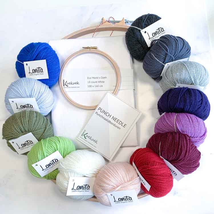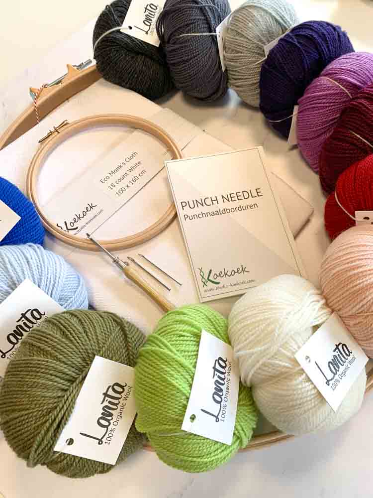Punnaaldset met 3 maten punchnaald set, quiltring monniksdoek, ecologische merinowol, borduurring, instructies en een willekeurig patroon